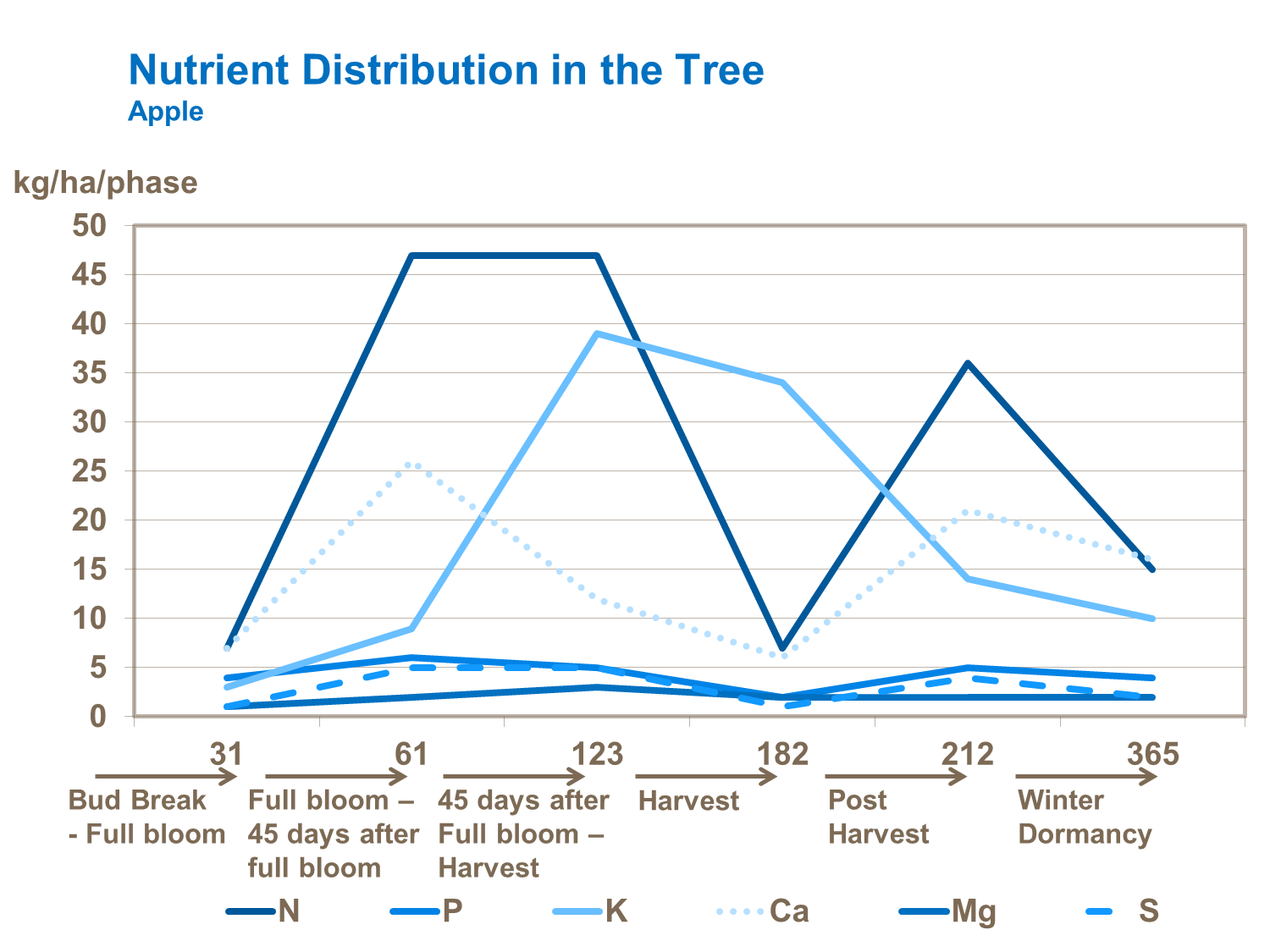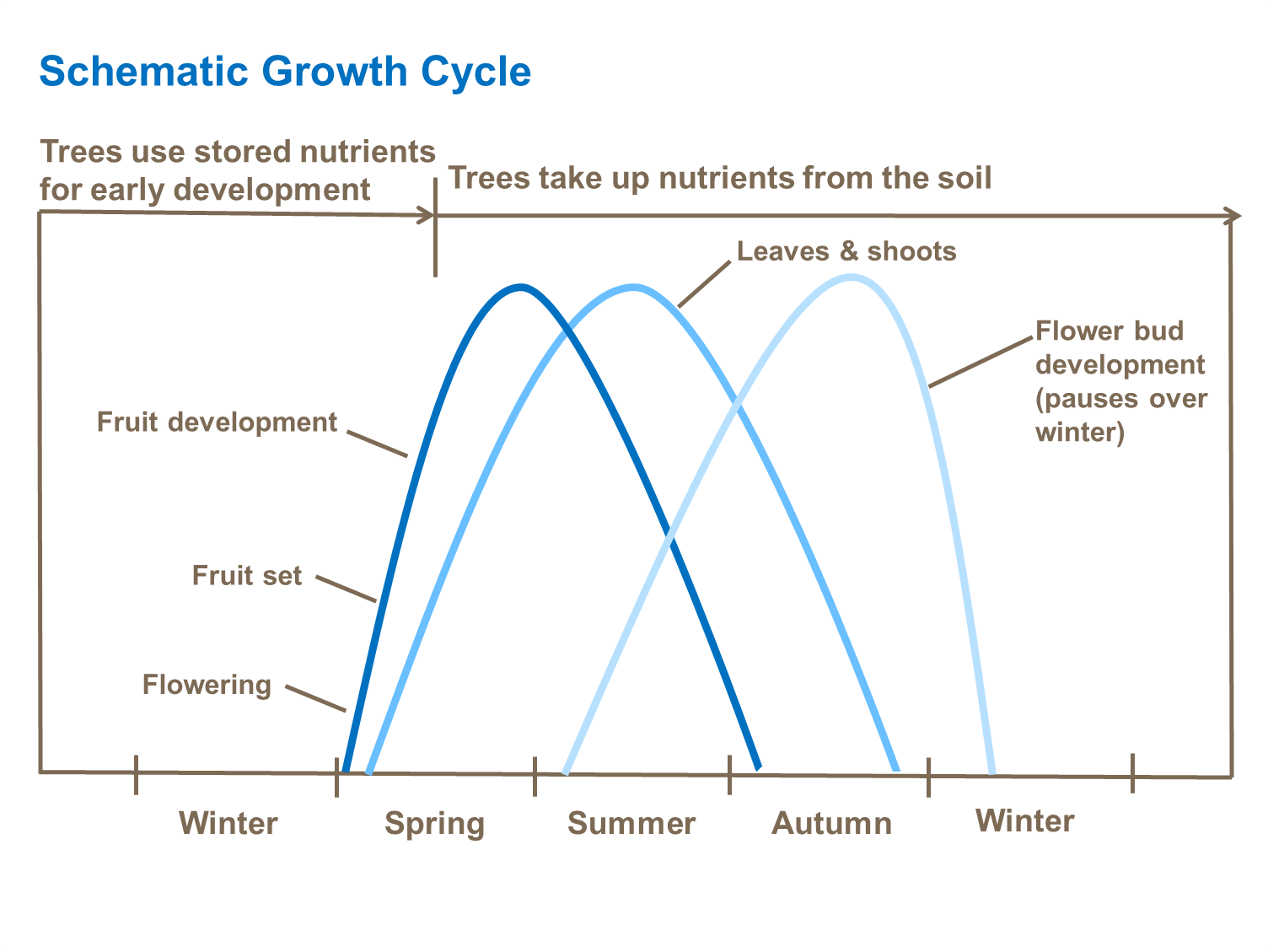 Une proportion importante d’azote est utilisée au début de la saison pour fournir une bonne croissance végétative des feuilles, des fleurs et la nouaison. Une quantité excessive d’azote appliqué ultérieurement peut nuire à la qualité des fruits. Par conséquent, il est courant d’appliquer de l’azote à deux étapes principales de la croissance. Tout d’abord à l’automne après la récolte, pour stimuler les réserves dans l’arbre, qui peuvent ensuite être remobilisées pour appuyer la floraison, la nouaison et le développement précoce des feuilles au début du printemps. Ensuite, au printemps à la floraison, pour favoriser le développement des fruits et des feuilles à la fin du printemps et pendant l’été.